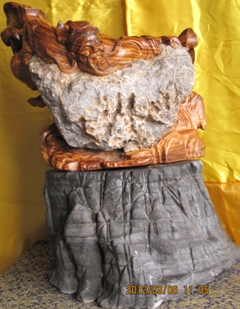 配之原作,不僅沒有喧賓奪主,相反底座與作品相得益彰,使作品更氣勢大度,使人似乎感悟到“收藏既是藝術品的集聚,更是精神財富的擁有”,另外《愚公移山》黃花梨根抱石配之以廣西幽蘭石的底座,更是難得一見的收藏精品,去年在展覽會榮獲第四屆“百慧杯”中國藝術家具“匠心神工”精華大賽工藝品類創意金獎。