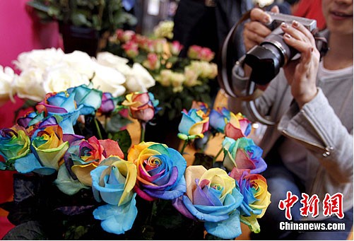 4月11日,第十四屆中國國際花卉園藝展覽會在北京開幕。展覽匯集了四百余家中外知名企業(yè),展出面積二萬三千平方米,同期舉辦四十場專業(yè)講座。圖為展出的進(jìn)口“七彩玫瑰”吸引觀眾。