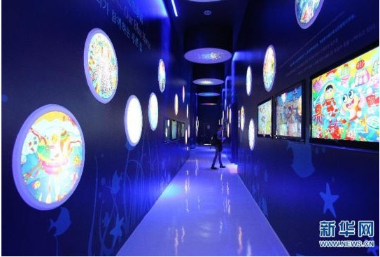 長廊兩邊的畫作都是中國孩子的作品