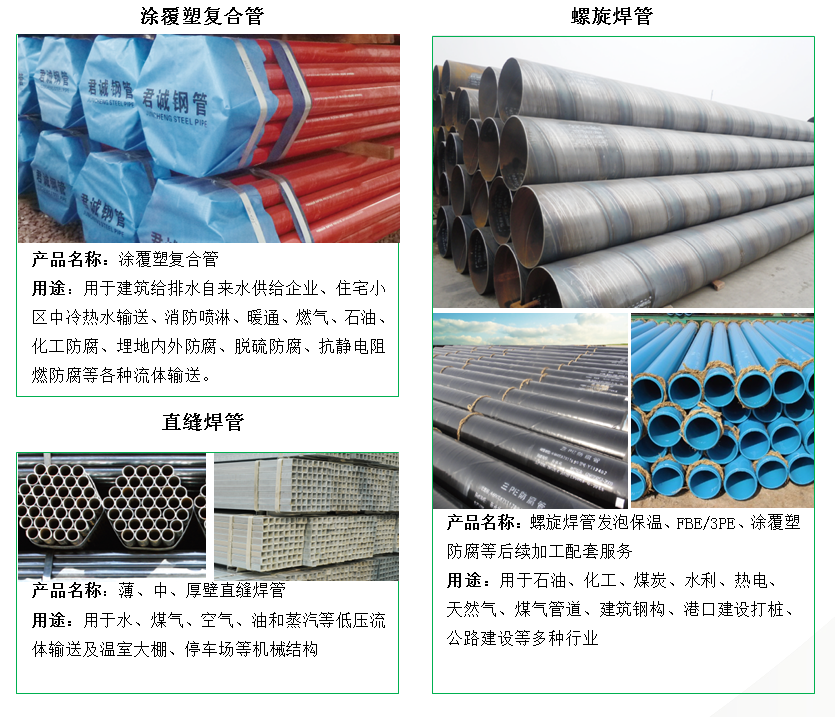 君誠管道集團是中國制造業企業500強、中國民營企業制造業500強和中國產地名牌產品企業。集團公司總部在北京,產銷基地坐落在——天津蔡公莊工業園區、山東焦橋南部工業園區和內蒙古包頭九原工業園區。各子公司總占地近800畝,資產總計二十余億元,擁有熱鍍鋅鋼管生產線16條、直縫焊接鋼管生產線20條、襯塑復合管生產線11條、涂覆塑復合管生產線6條、螺旋縫雙面埋弧焊鋼管生產線6條、方矩鋼管生產線5條,以及預涂覆熱浸鋅鋼管、管接件等其他生產制造設施。君誠管道在全國產品行業規模綜合處于前列,制定中國鋼管國家標準——《低壓流體輸送用焊接鋼管》(GB/T3091)、國家電網系統《輸電線路鋼管塔用直縫焊管》、《直縫電焊鋼管》(GB/T13793)、《國家電網特高壓輸電線路用管》、《給水涂塑復合鋼管》(CJ/T 120)、《國家排水用小螺距鋼塑復合用管》、《內襯內覆不銹鋼復合鋼管管道工程技術規程》、《鋼塑復合管》(GB/T28897)等標準。年設計生產能力Φ21-Φ219mm熱鍍鋅鋼管120萬噸、Φ21-Φ273mm直縫焊管180萬噸、Φ219-Φ3020mm螺旋鋼管30萬噸、鋼塑復合管20萬噸、方矩鋼管20萬噸,以及預涂覆熱浸鋅鋼管、管接件等各類管道和其他相關產品年制造能力近400萬噸。