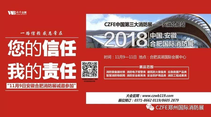 由威博會展|CZFE鄭州國際消防展組委會打造的2018安徽(合肥)國際消防展,將于11月9日-11日在合肥濱湖國際會展中心盛大召開,展覽面積10000平米,展位設立500個,參展企業230家(中部消防科技產品采購盛會)!