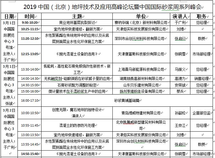 為加快地坪行業新技術、新材料、新工藝的推廣和應用,增進地坪與砂漿行業的跨界合作與交流,展會期間組委會將聯合中國室內裝飾協會施工委員會、中國砂漿網等機構共同舉辦2019中國(北京)地坪技術及應用高峰論壇暨2019中國(北京)砂漿與地坪合作交流大會。具體議程如下:
