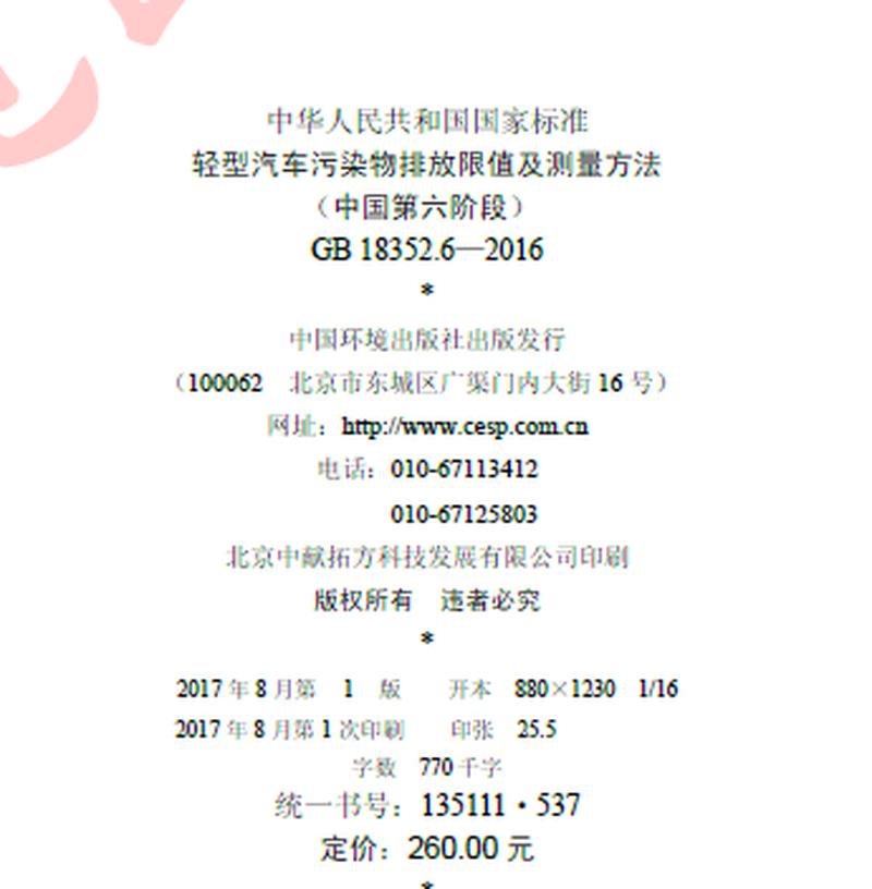 國六標準的全文,有400頁之巨,可在中華人民共和國生態環境部官網下載到電子版——如果你有興趣翻到最后一頁,還會發現這套標準已有書刊號、且印刷出版,定價260元。