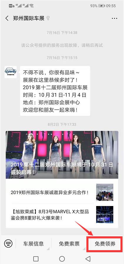 1、關(guān)注“鄭州國(guó)際車(chē)展”官方微信,選擇菜單欄“免費(fèi)索票”,點(diǎn)擊“免費(fèi)搶票”;