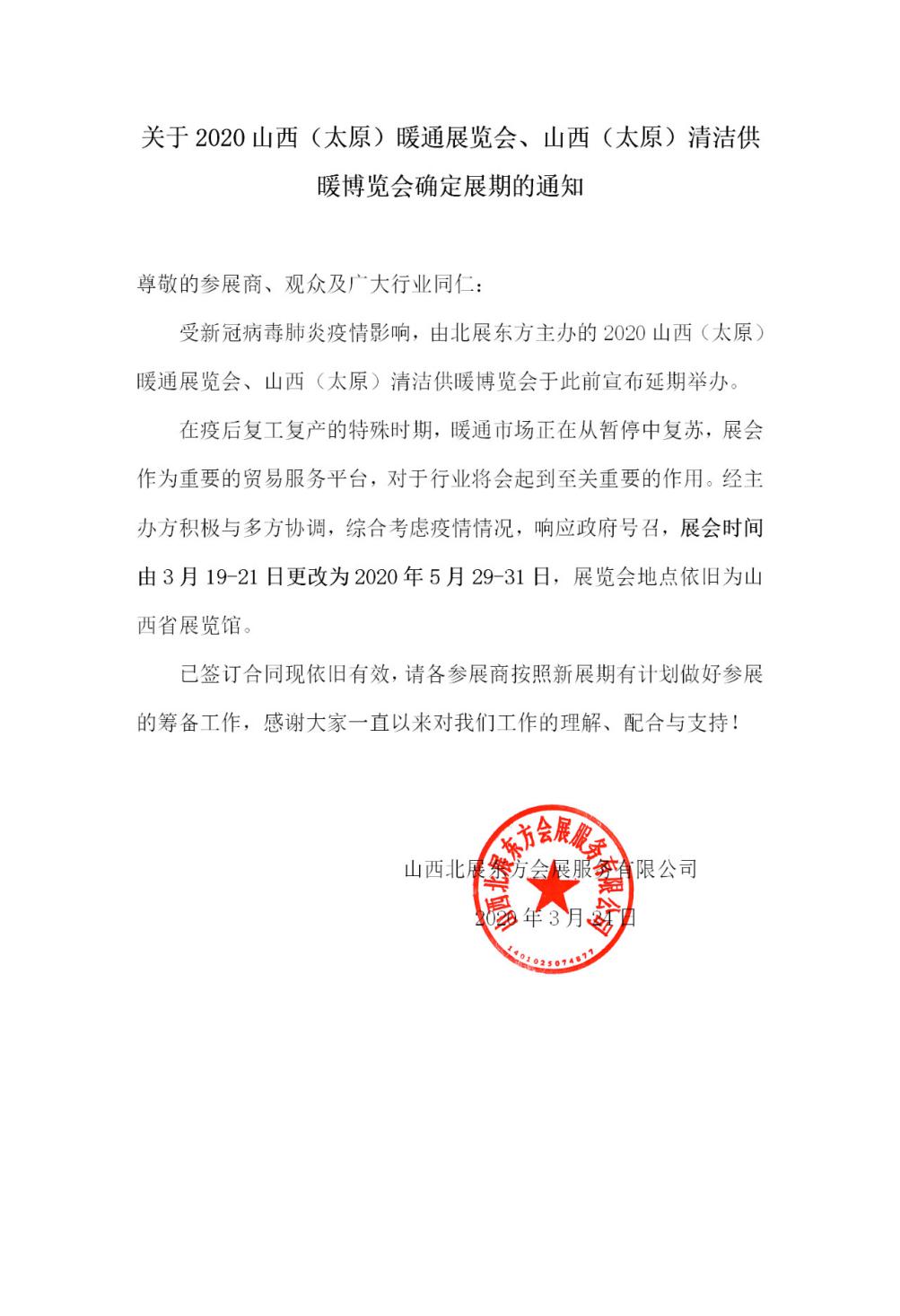 根據(jù)新型肺炎疫情防控需要,為貫徹落實(shí)黨中央和山西省政府做好新型冠狀病毒感染的肺炎疫情防控工作,切實(shí)保障廣大參展商和觀眾及各界朋友們的健康安全,確保參展企業(yè)的參展效果和采購(gòu)商的參觀體驗(yàn),原定于3月19-21日在山西舉辦的2020山西(太原)暖通展覽會(huì)延期至5月29-31日舉辦。