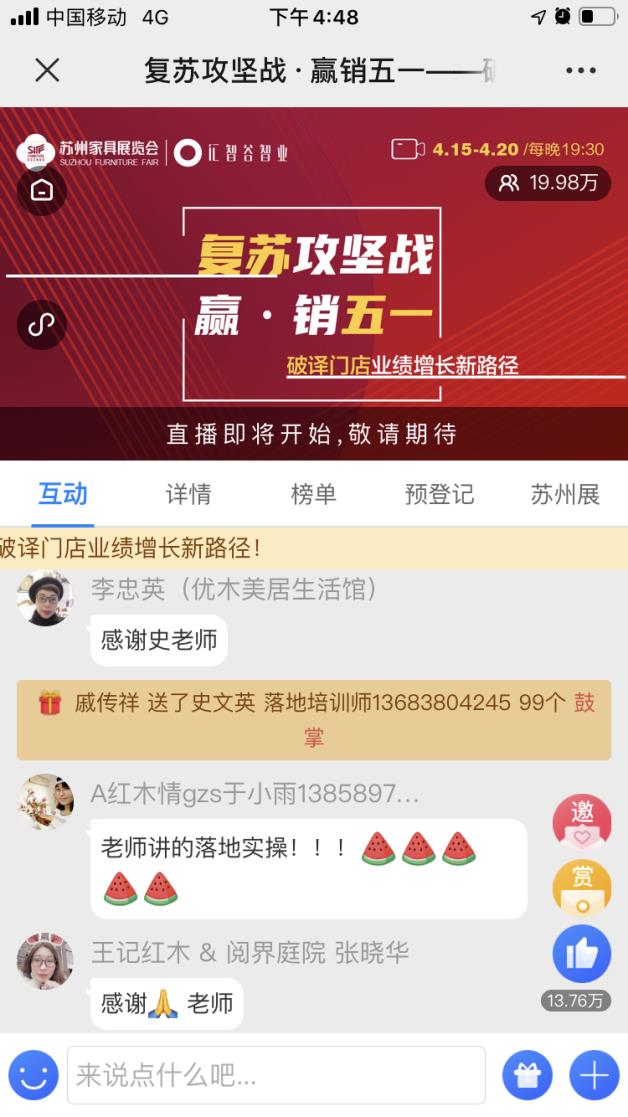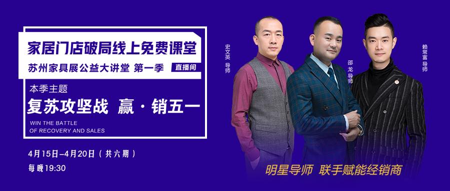 為幫助家具人破局突圍,蘇州家具展調動得一集團資源啟動【復蘇攻堅戰贏·銷五一】的暖春行動公益直播,賦能家具門店。4月15-20日每晚7點半,三位家具行業重量級講師在線開播,累計20萬人次觀看,抓重點解難題,對當下家具線下門店經營痛點進行了深入細致的解析。