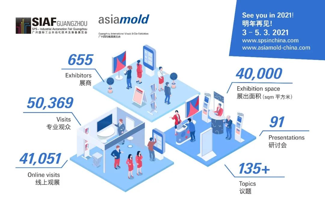 下一屆SIAF廣州國際工業自動化技術及裝備展覽會及Asiamold 廣州國際模具展將于2021年3月3至5日舉辦。預知更多廣州國際工業自動化技術及裝備展覽會 (SIAF)資訊,請發送郵件至sps@china.messefrankfurt.com,預知更多廣州國際模具展覽會 (Asiamold)資訊,請發送郵件至asiamold@china.messefrankfurt.com。