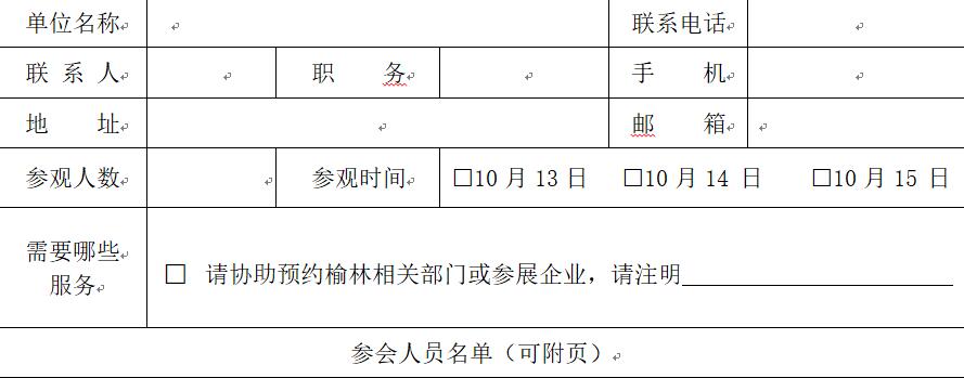 在榆林國際煤博會官網(wǎng)“www.cycechina.com”下載中心,下載附件“榆林國際煤博會團體申請表”,填寫后回傳至xxxxxx郵箱。