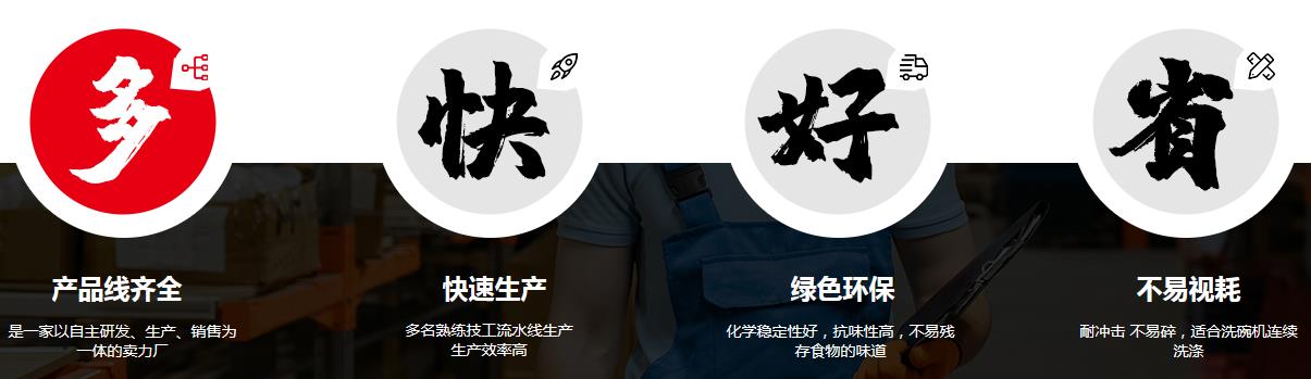 工廠生產的密胺餐具美觀耐用、色澤鮮艷、光潔度好、抗擊力強、耐高溫、無毒無味, 特別適合火鍋、燒烤、連鎖快餐、賓館酒店及學校食堂使用。