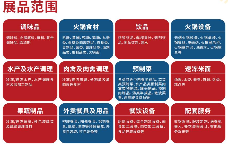 從規模看,上海火鍋展同期舉辦第二十六屆FHC上海環球食品展,展覽面積20,0000㎡,17館聯動,15,0000專業采購商,12大品類,涵蓋調味品、火鍋食材、飲品、火鍋設備、水產及水產調理、肉禽及肉禽調理、預制菜、速凍米面、果蔬制品、外賣餐具及用品、餐飲設備、配套服務等產業鏈覆蓋面更加寬廣。
