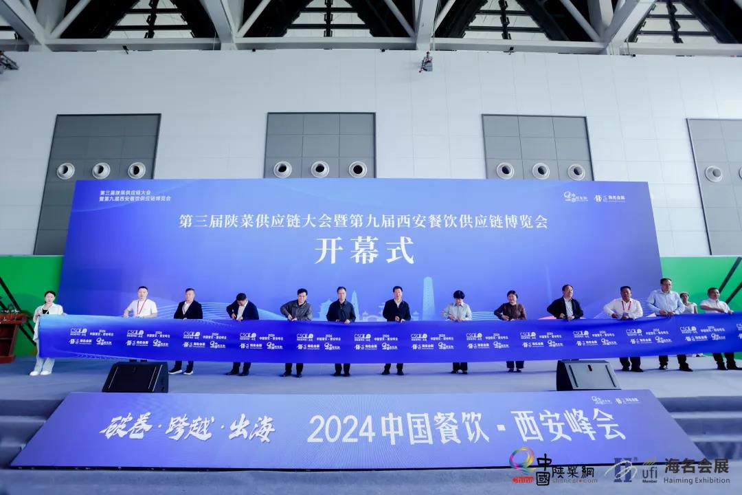 陜西省商務(wù)廳副廳長郭紹敏;陜西省三秦文化研究會會長張社年;西安市商務(wù)局一級調(diào)研員陸晴;陜西省三秦文化研究會副會長、陜西金控集團(tuán)原董事長權(quán)永生;陜西省三秦文化研究會副會長王宏;陜西省三秦文化研究會副會長、陜西旅游集團(tuán)總經(jīng)理任公正;重慶市小面協(xié)會會長張壽江;蘭州烹飪協(xié)會會長趙順謙;陜味食族油潑面創(chuàng)始人陳雷;深圳老碗會創(chuàng)始人楊富強(qiáng);陜西省餐飲聯(lián)合會駐會會長黨小兵;西安飯店與餐飲行業(yè)協(xié)會會長王小唐共同剪彩,第三屆陜菜供應(yīng)鏈大會暨海明·2024第9屆西安餐飲供應(yīng)鏈博覽會正式啟動。