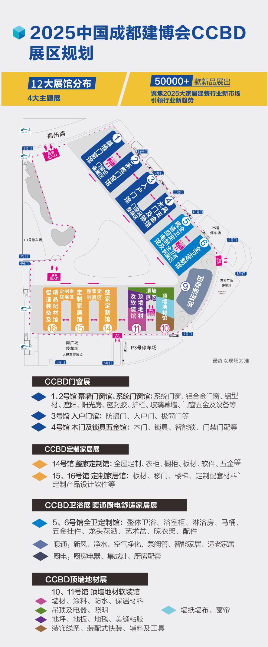 本屆展會擁有12個展館+6個連接館,全面創新升級展館規劃,主要分為CCBD門窗展、CCBD定制家居展、CCBD全衛定制及暖通廚電展、CCBD頂墻地材展,分類更加清晰明了。