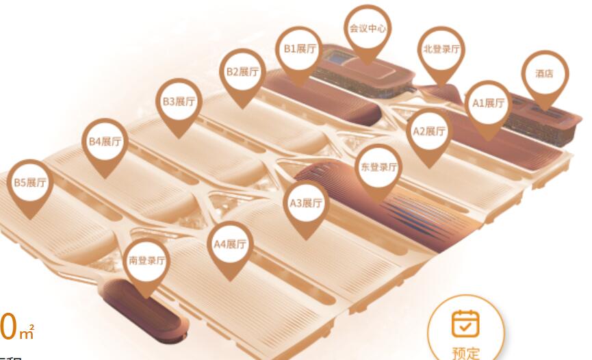 展覽中心由3個登錄廳(東、北、南)、2個無柱展廳(A1、B1)和7個有柱展廳(A2-A4、B2-B5)組成,室內凈展面積達21萬平方米,室外展場面積達5萬平方米,為參展人員提供流暢的通行路線、為展臺搭建留出充裕的布展空間、為物流運輸打造高效的行進通道。